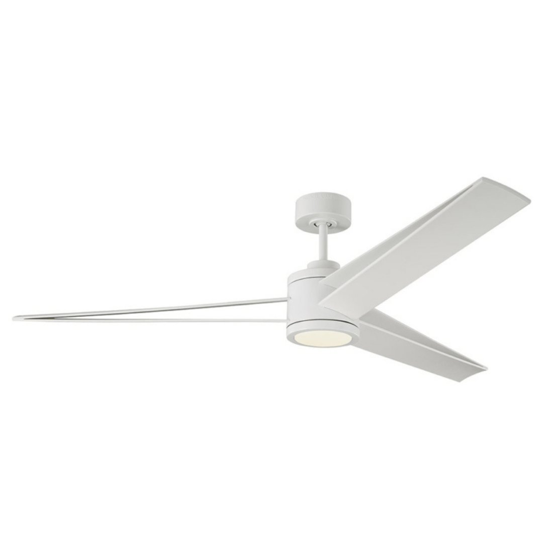 Ventilador de techo de 6 aspas encontradas en 3 puntas, tiene un estilo moderno con eficiencia energética y motor reversible de 6 velocidades a control remoto. Iluminación LED descendente incluida.