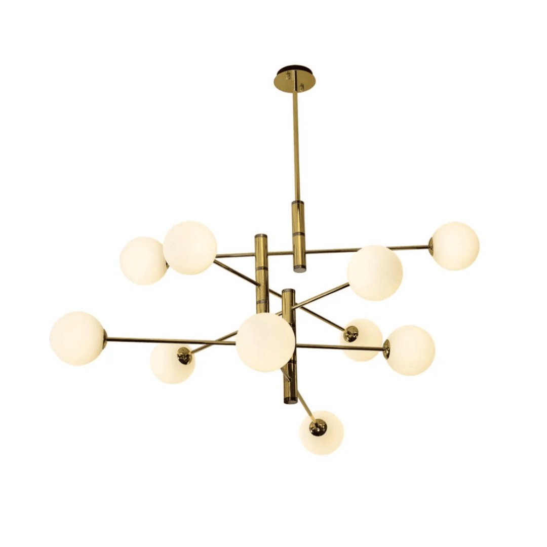 Lámpara de techo con 10 focos de luz en cristal opalizado, estructura metálica en color dorado con brazos ajustables direccionables.