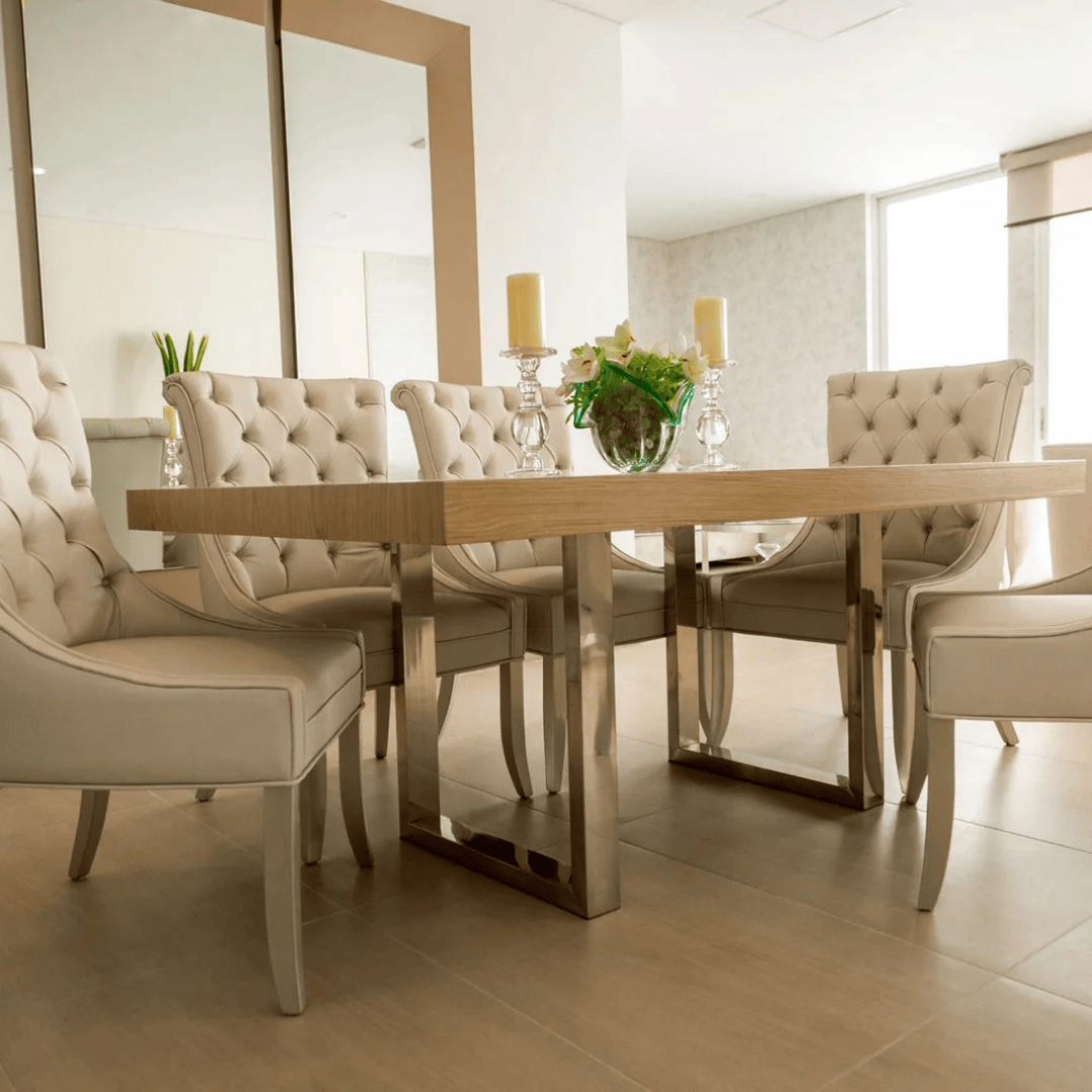 Esta mesa de comedor donde la combinación de la madera natural y el acero le dan un toque aún más especial.