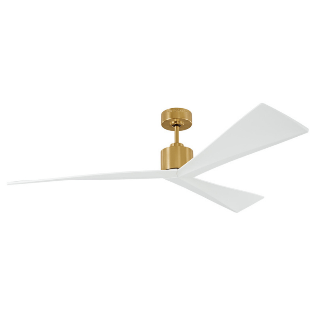 Ventilador de techo con tres aspas inclinadas talladas de forma única. El motor de CC proporciona un potente flujo de aire y una excelente eficiencia energética. Incluye control remoto de mano con seis velocidades.